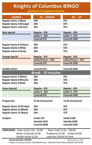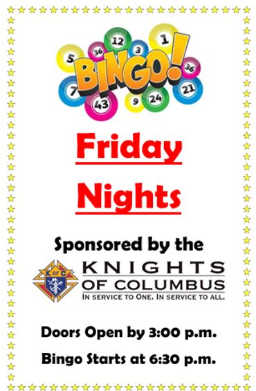 BINGO EVERY FRIDAY DOOR'S OPEN 4 PM STARTS 6:30 PM See Bingo tab for more info